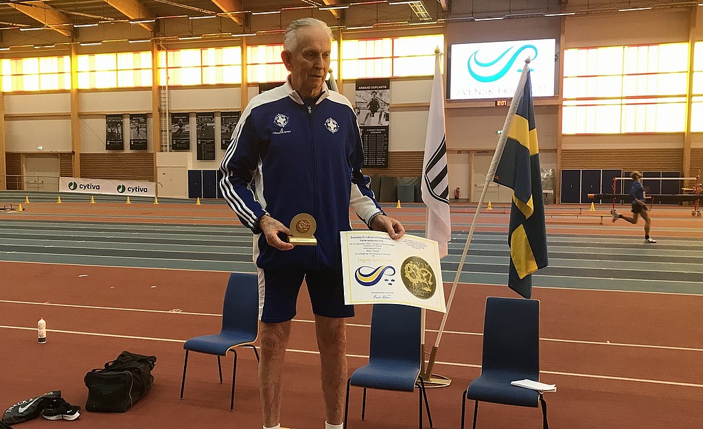 Ingvar Lindqvist, nu tävlandes i M85, med ett av de finaste priser en veteran kan få.