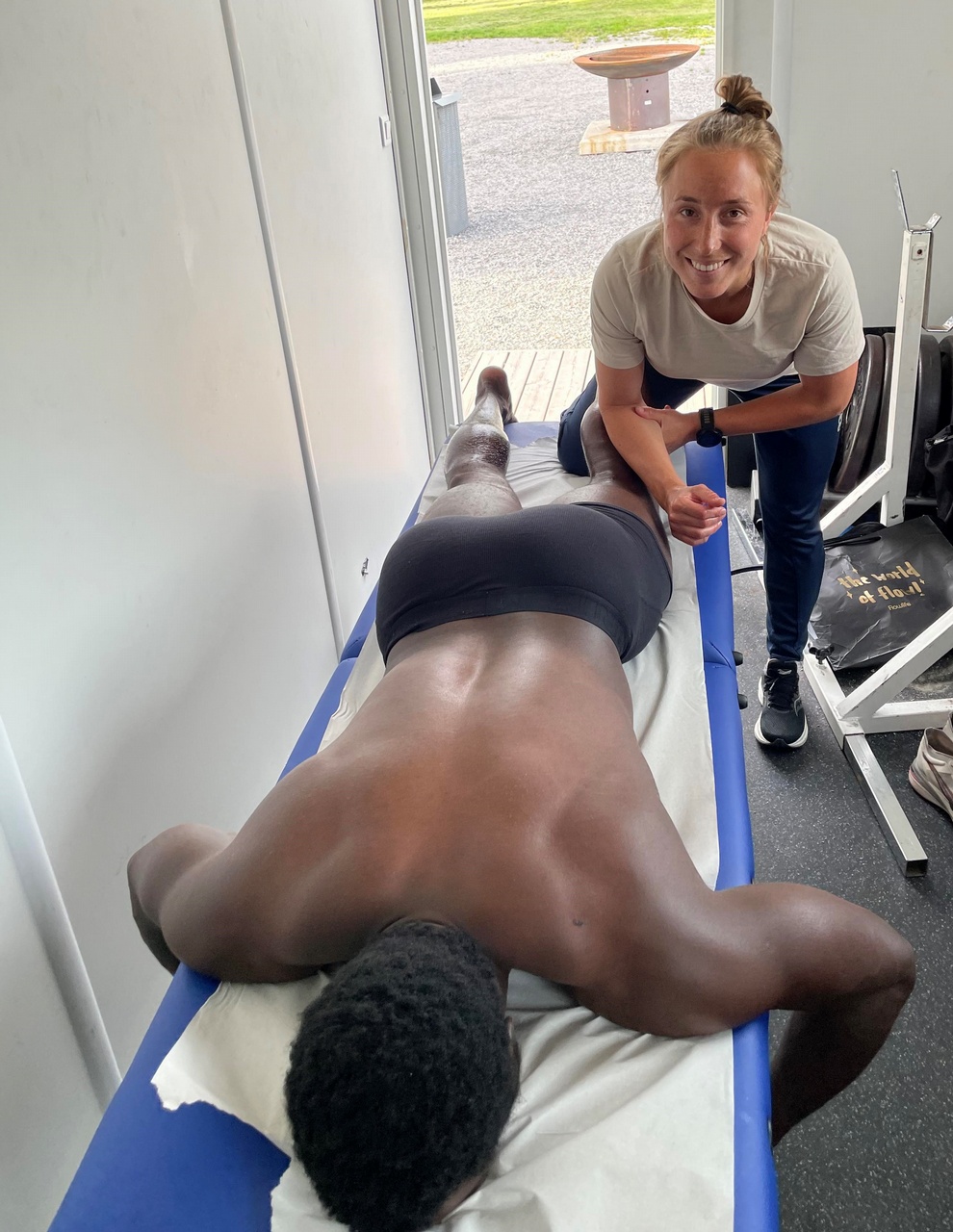 Under några månader har vi nu haft ett samarbete med Evelina på Lidingö Kiropraktik. Framför allt hjälper hon våra elitaktiva med att varannan vecka komma till Lidingövallen för att ge dom en behandling som tex här på bilden där Desmond Rogo är den tacksamma.
