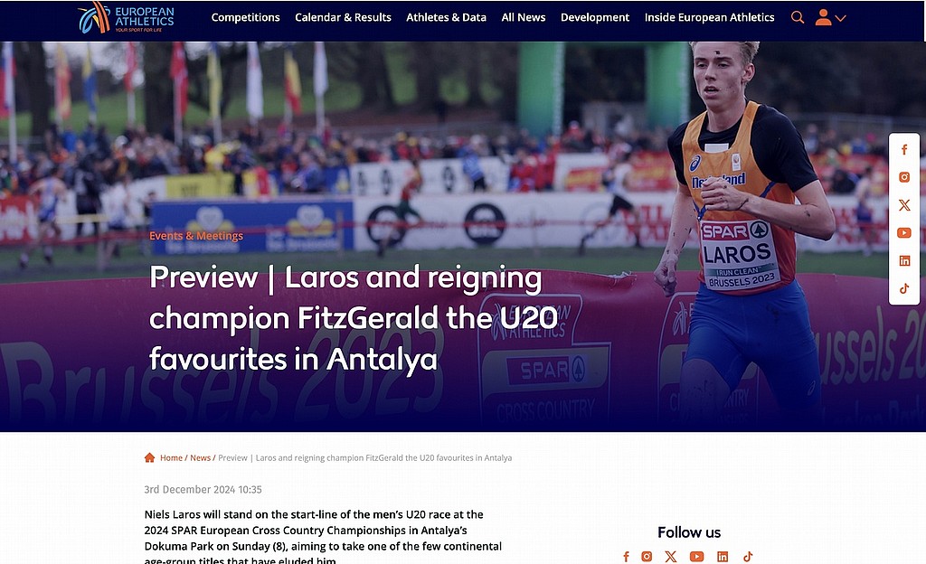 På European Ahtletics webbplats kan man läsa mer. Där står det även en del om favoriterna i U20-klassen där IFKs Kalle Ottfalk nämns även om Nederländernas Laros utmålas som storfavorit. Så här står det bland annat: