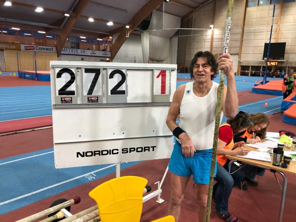Två å sjuttiotvå! Ja, så lyder det nya svenska rekordet i stavhopp för M75. Inge Hermansson är den stolta innehavaren. Foto: Thomas Lindberg