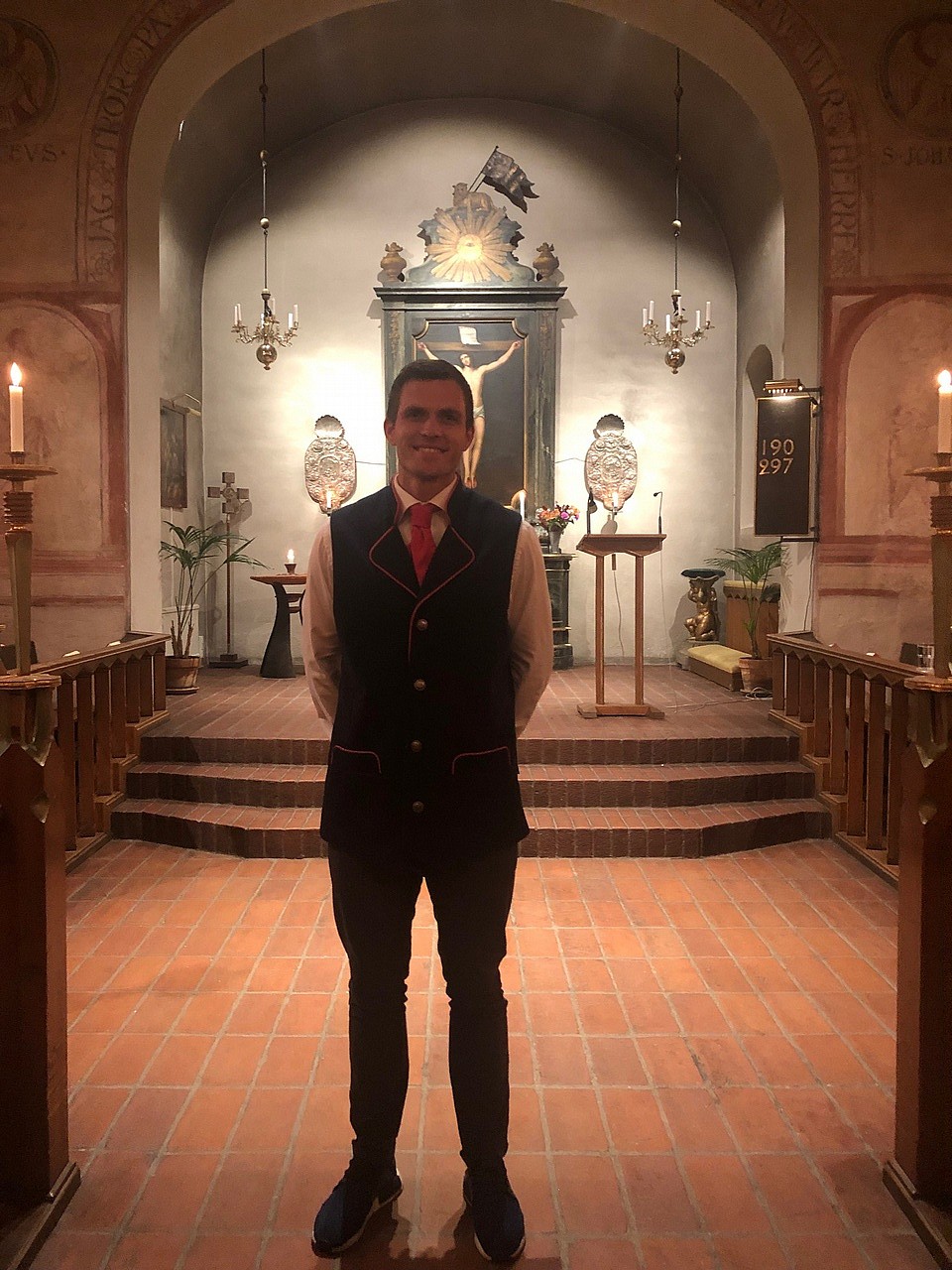 Kranskillen Andreas Otterling i samband med invigningen av TCS Lidingöloppet 2019 i Lidingö kyrka. Foto: Mikkel Mördrup
